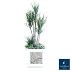 このアレンジメントの主役はユッカという植物をモチーフにした造花で、葉の形状や色合いが非常にリアルに再現されています。葉の緑色は深みがあり、光の加減で異なる表情を見せるため、自然な雰囲気を演出します。