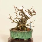 長寿梅は、盆栽愛好家の間で人気の高い落葉樹の一種で、春と秋に小ぶりで愛らしい赤い花を咲かせるのが特徴です。樹高約15cm、横幅約16.5cmの小品盆栽として親しまれており、鉢径約13.5cmの秀峰鉢に植えられています。古い枝や幹には時代の重みが感じられ、長年にわたって丁寧に育てられてきたことが一目でわかる風格があります。